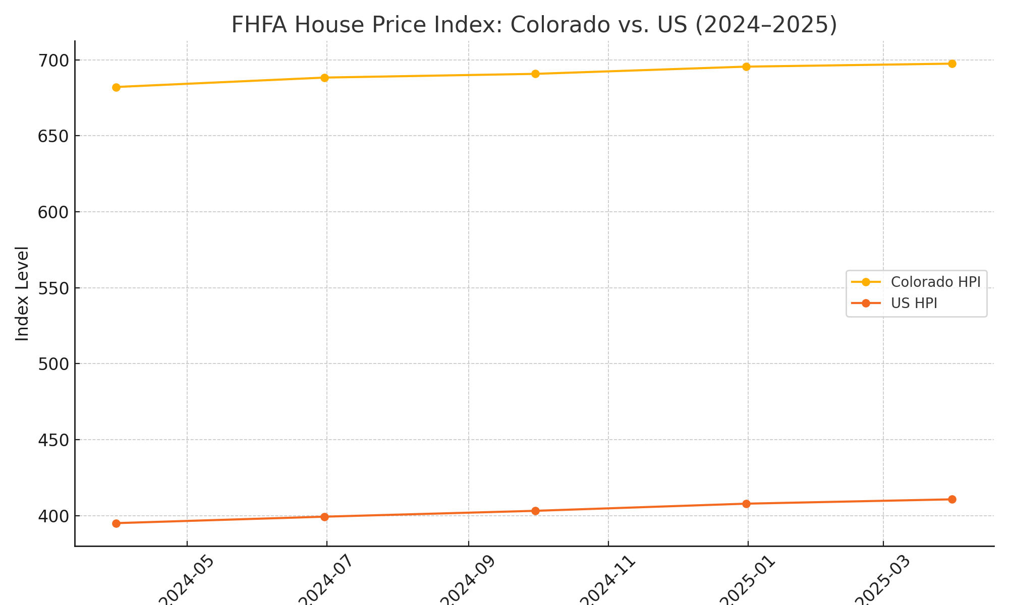 According to the Federal Housing Finance Agency (FHFA), Colorado home prices rose about 1.93% year-over-year as of Q1 2025. That’s below the national increase of 4.0%. While prices remain high, the rapid appreciation of the past few years has tapered off.